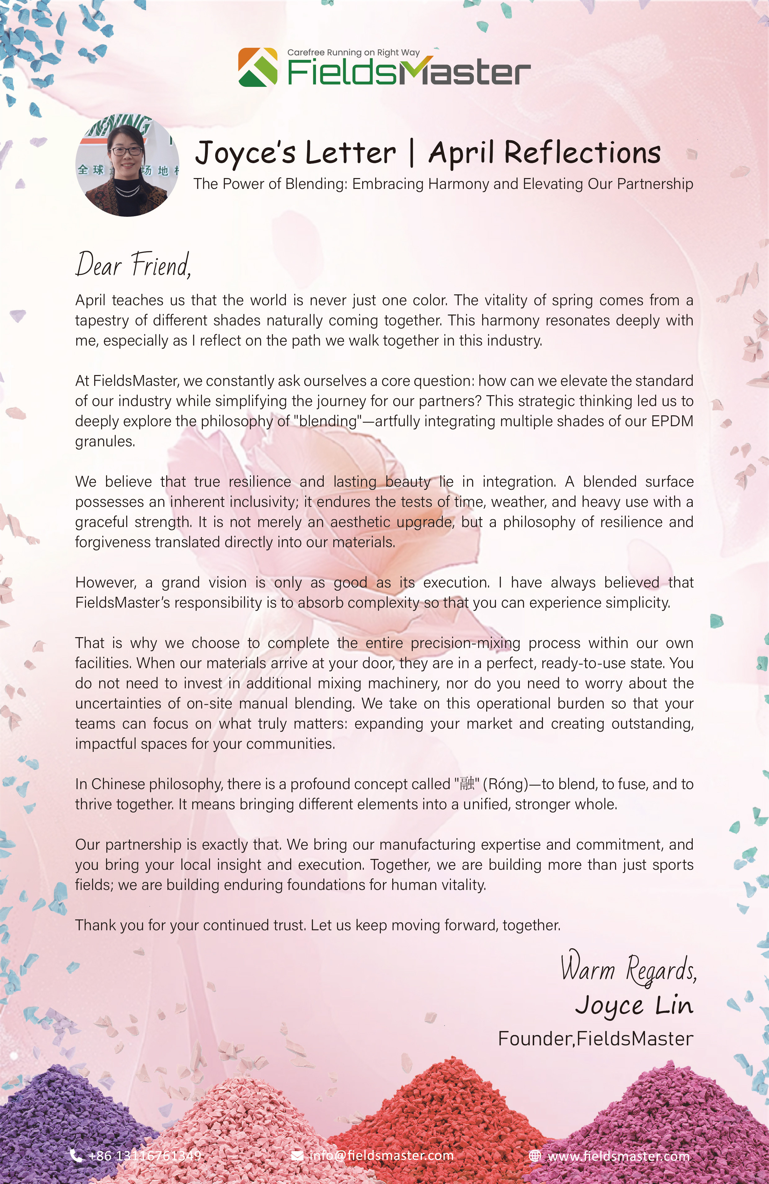 Discover how blending EPDM granules enhances sports surface durability. Read FieldsMaster Founder Joyce Lin's reflections on factory precision mixing and the philosophy of "Róng."